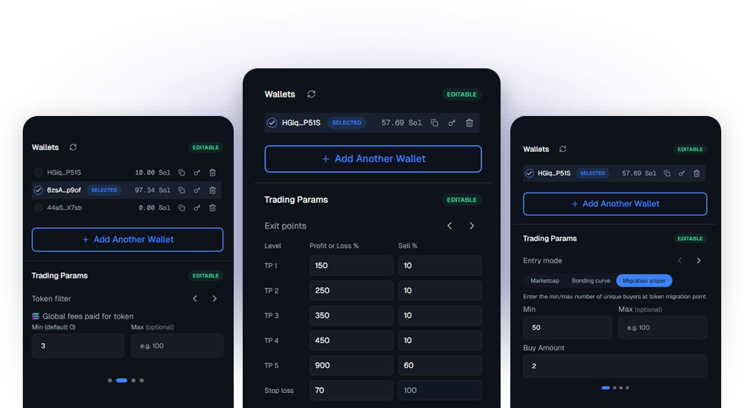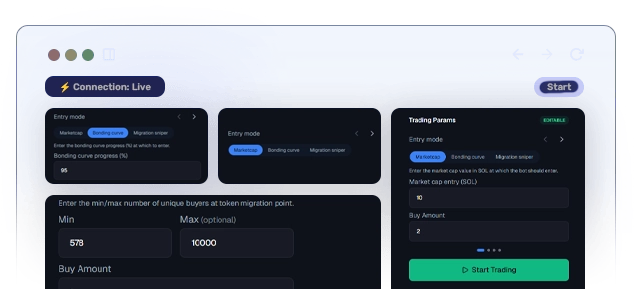 Choose your entry mode, market cap threshold (SOL), bonding curve progress %, or migration sniper with unique buyer count filters. Set your buy amount per trade.