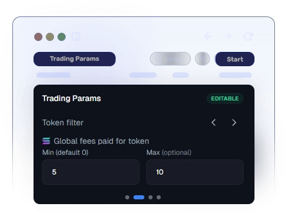 Filter tokens by global fees paid (priority fees + Jito tips + gas) since creation. Set min and max thresholds to target active tokens and skip dead or over-traded ones.