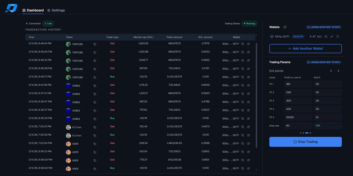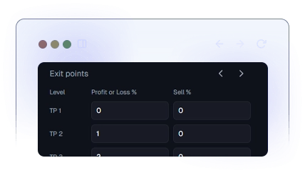 Configure up to 5 take-profit levels with custom sell percentages at each target, plus a stop-loss threshold that automatically exits your full position to protect capital.