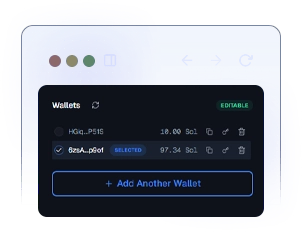 Generate new wallets, import existing ones, view real-time SOL balances, and export private keys. All keys are encrypted.