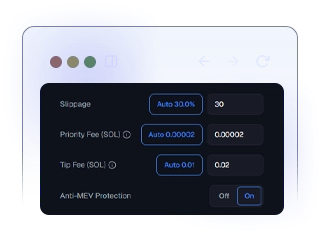 Adjust slippage, priority fee, and Jito tip (auto or custom). Enable anti-MEV protection against sandwich attacks.